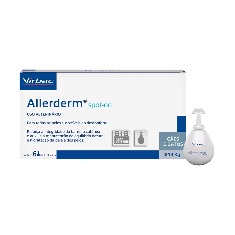 - Indicação: Allerderm spot-on S-1-S é indicado para a hidratação, o equilíbrio e a manutenção da integridade natural da pele e dos pelos de cães e gatos. O seu efeito hidratante é resultado da exclusiva combinação de glicosídeos e extratos vegetais, além de possuir em sua formulação ceramidas e ácidos graxos em quantidades similares às encontradas na pele saudável.