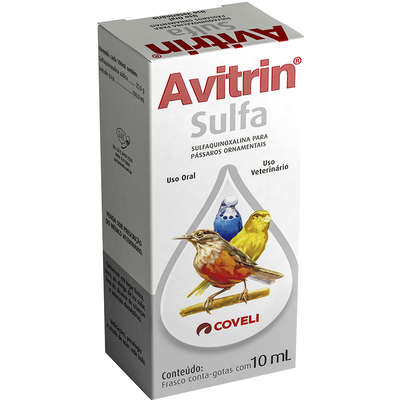 O Antibiótico Avitrin Sulfa é indicado para pássaros e aves ornamentais contra cólera aviária, salmonelose e coccidiose. Para o tratamento de infecções em aves como cólera aviaria (Pasteurella multocida), salmonelose (Salmonella spp.) e coccidiose (Eimeria spp.).