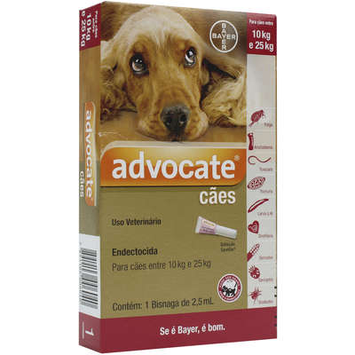 O Antipulgas Bayer Advocate com 2,5 mL é indicado para a prevenção e tratamento das infestações por pulgas, piolhos, ácaros das sarnas otodética, sarcóptica e demodécica e os vermes intestinais em cachorros de até 10 Kg a 25 Kg de peso. O produto deve ser aplicado de acordo com o peso do cão na região da nuca do animal, afastando os pelos. Pode ser aplicado após o banho quando o pelo e a pele do animal estiverem secos.