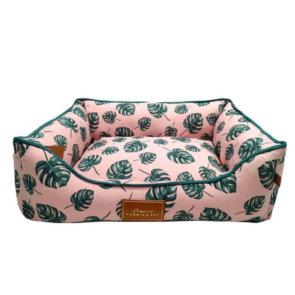 Cama Folhagem Fábrica Pet Rosa A Cama Folhagem é um modelo exclusivo Fábrica Pet, possui design simples e muito elegante, desenvolvida em cores neutras e com uma estampa incrível de folhas “costela de adão”, proporciona maior conforto e bem-estar ao seu pet.