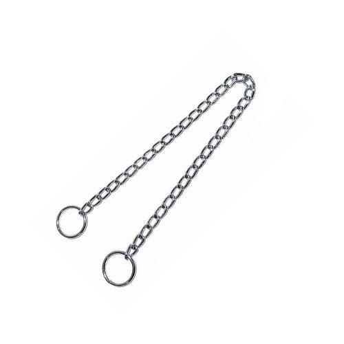 Feito de aço. Composto de Ferro banhado em cromo. Elos não soldados.