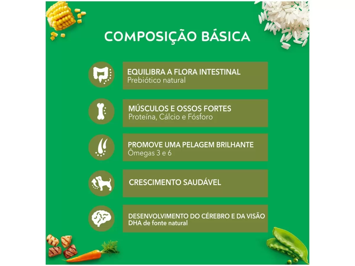 Um alimento 100% completo e balanceado, com multivitaminas e minerais, nutrientes essenciais para o bom funcionamento do metabolismo e que auxiliam o seu pet a ter saúde e vitalidade por muito tempo.