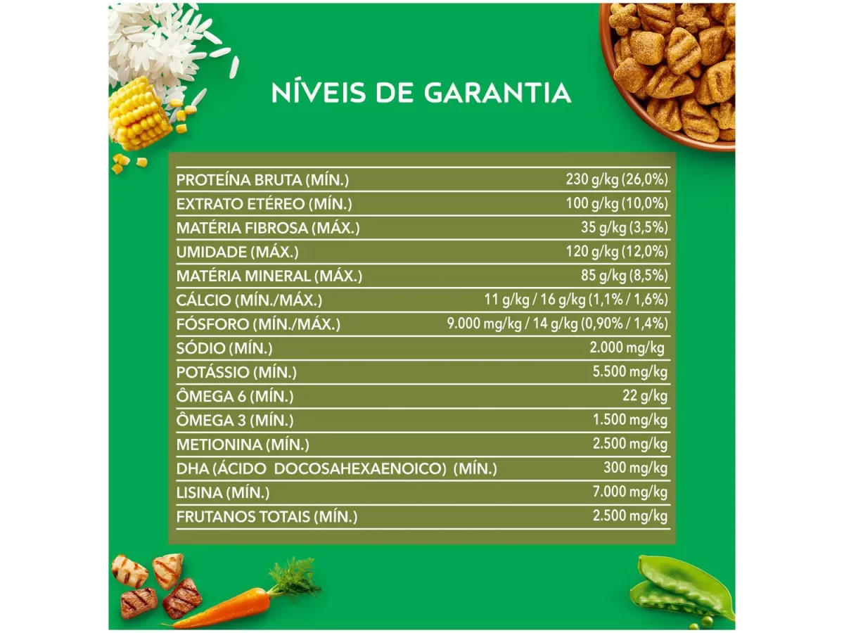 Grão de milho*, farinha de carne e osso de suínos, farinha de vísceras de aves, farinha de atum, farelo de soja*, farelo de glúten de milho (60)*, quirera de arroz, casca de soja*, gordura de frango, hidrolisado de fígado de aves e suínos, cloreto de sódio, inulina, cloreto de potássio, carbonato de cálcio, cenoura, ervilha moída desidratada, DL-metionina, L-Lisina, vitaminas (retinol, colecalciferol, acetato de D-alfa-tocoferol, ácido ascórbico, menadiona bissulfito de sódio, tiamina, riboflavina, niacina (ácido nicotínico), D-pantotenato de cálcio, cloridrato de piridoxina, biotina, ácido fólico, cianocobalamina, cloreto de colina), minerais (sulfato de zinco monohidratado, sulfato ferroso monohidratado, sulfato de manganês monohidratado, sulfato de cobre pentahidratado, iodato de cálcio, selenito de sódio, proteinato de cobre, proteinato de ferro, proteinato de manganês, proteinato de selênio, proteinato de zinco) e BHT. Eventuais Substitutivos: farinha de carne e osso de bovinos, farinha de salmão, farinha de peixes, farinha de sardinha, farinha de tilápia, farinha hidrolisada de aves, grão de sorgo, trigo integral, farelo de glúten de milho (21)*, gordura suína, fosfato bicálcico, biomassa de microalgas (Schizochtrium sp.), hidrolisado de fígado desidratado de aves, hidrolisado de fígado desidratado de suínos, farinha de pena hidrolisada, triguilho, grão de triticale e milheto.