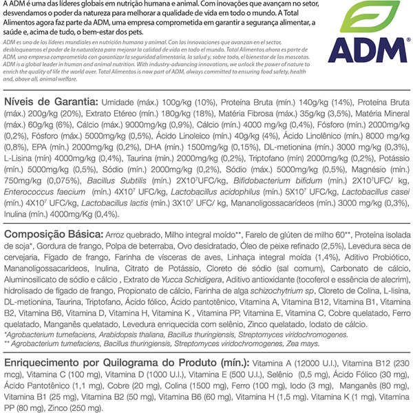 Arroz quebrado, Milho integral moído**, Farelo de glúten de milho 60**, Proteína isolada de soja*, Gordura de frango, Polpa de beterraba, Ovo desidratado, Óleo de peixe refinado (2,5%), Levedura seca de cervejaria, Fígado de frango, Farinha de vísceras de aves, Linhaça integral moída (1,4%), Aditivo Probiótico, Mananoligossacarídeos, Inulina, Citrato de Potássio, Cloreto de sódio (sal comum), Carbonato de cálcio, Aluminosilicato de sódio e cálcio , Extrato de Yucca Schidigera, Aditivo antioxidante (tocoferol e essência de alecrim), hidrolisado de fígado de frango, Propionato de cálcio, Farinha de alga schizochytrium sp, Cloreto de Colina, L-lisina, DL-metionina, Taurina, Triptofano, Ácido fólico, Ácido pantotênico, Vitamina A, Vitamina B12, Vitamina B1, Vitamina B2, Vitamina B6, Vitamina D, Vitamina H, Vitamina K , Vitamina PP, Vitamina E, Vitamina C, Cobre quelatado, Ferro quelatado, Manganês quelatado, Levedura enriquecida com selênio, Zinco quelatado, Iodato de cálcio. *Agrobacterium tumefaciens, Arabidopsis thaliana, Bacillus thuringiensis, Streptomyces viridochromogenes. ** Agrobacterium tumefaciens, Bacillus thuringiensis, Streptomyces viridochromogenes, Zea mays. |