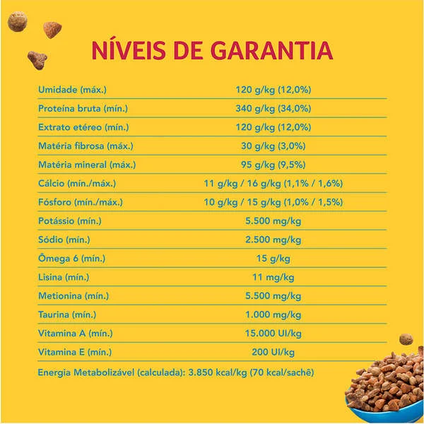 Milho integral moído*, farelo de glúten de milho*, farelo de soja*, farinha de carne e ossos de bovinos, farinha de subprodutos de frango, gordura animal estabilizada, quirera de arroz, trigo integral moído, leite em pó desnatado (0,1%), cenoura desidratada, cloreto de sódio (sal comum), fosfato bicálcico, cloreto de potássio, hidrolisado de fígado de ave e suíno, L-lisina, DL-metionina, taurina, vitaminas (A, D3, E, K3, B12, mononitrato de tiamina, suplemento de riboflavina, pantotenato de cálcio, cloreto de piridoxina, niacina, biotina, ácido fólico, pantotenato de cálcio, cloreto de colina), minerais ( sulfato de zinco, sulfato ferroso, sulfato de cobre, sulfato de manganês, iodato de cálcio, selenito de sódio), corantes ( amarelo 5, amarelo 6, vermelho 40, azul 2 e dióxido de titânio), ácido fosfórico, antioxidante (BHT). *Ingredientes transgênicos. Espécies doadoras de gene: Agrobacterium tumefaciens, Arabidopsis thaliana, bacillus thuringiensis, Streptomyces viridochromogenes e Zea mays. Eventuais substitutivos: sorgo integral moído, farinha de carne e ossos de suínos e farinha de subprodutos de peru. |