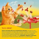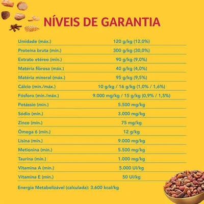 | Composição | Farinha de subprodutos de frango (1,0%), farinha de carne e ossos de bovino (1,0%), farinha de atum (1,0%), farinha de peru (1,0%), farinha de peixe salmão (1,0%), farinha de camarão (1,0%), milho integral moído*, farelo de soja*, farelo de glúten de milho – 60*, gordura de frango, levedura seca de cervejaria, hidrolisado de fígado de ave e suíno (1,0%), ácido fosfórico, cloreto de sódio (sal comum), cloreto de potássio, carbonato de cálcio, DL-metionina, taurina, L-lisina, vitaminas (A, D3, E, K3, B1, B2, niacina, pantotenato de cálcio, B6, biotina, ácido fólico, B12, cloreto de colina), minerais (sulfato de zinco, proteinato de zinco, sulfato ferroso, proteinato de ferro, sulfato de manganês, proteinato de manganês, sulfato de cobre, proteinato de cobre, selenito de sódio, proteinato de selênio, iodato de cálcio), corantes (corante artificial vermelho allura, corante artificial amarelo tartrazina, corante artificial amarelo crepúsculo e corante artificial azul indigotina), antioxidante BHT. *Ingredientes transgênicos. Espécies doadoras do gene: Agrobacterium tumefaciens, Arabidopsis thaliana, Bacillus thuringiensis, Streptomyces viridochromogenes e Zea mays |