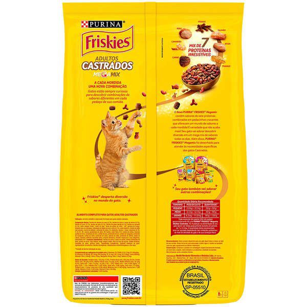 A Ração Seca Nestlé Purina Friskies Megamix para Gatos Castrados é um alimento completo e balanceado formulado para gatos adultos e castrados. Possui formatos que brincam com a imaginação do seu gato para que ele tenha nutrição, sabor e diversão todos os dias. Pele e pelos saudáveis graças aos níveis adequados de zinco e ácidos graxos essenciais. Visão clara e saudável devido à adição de vitamina A e taurina. Formulado com vitaminas e minerais que auxiliam nas defesas naturais. Músculos fortes e saudáveis devido à presença de fontes de proteínas de alta qualidade.