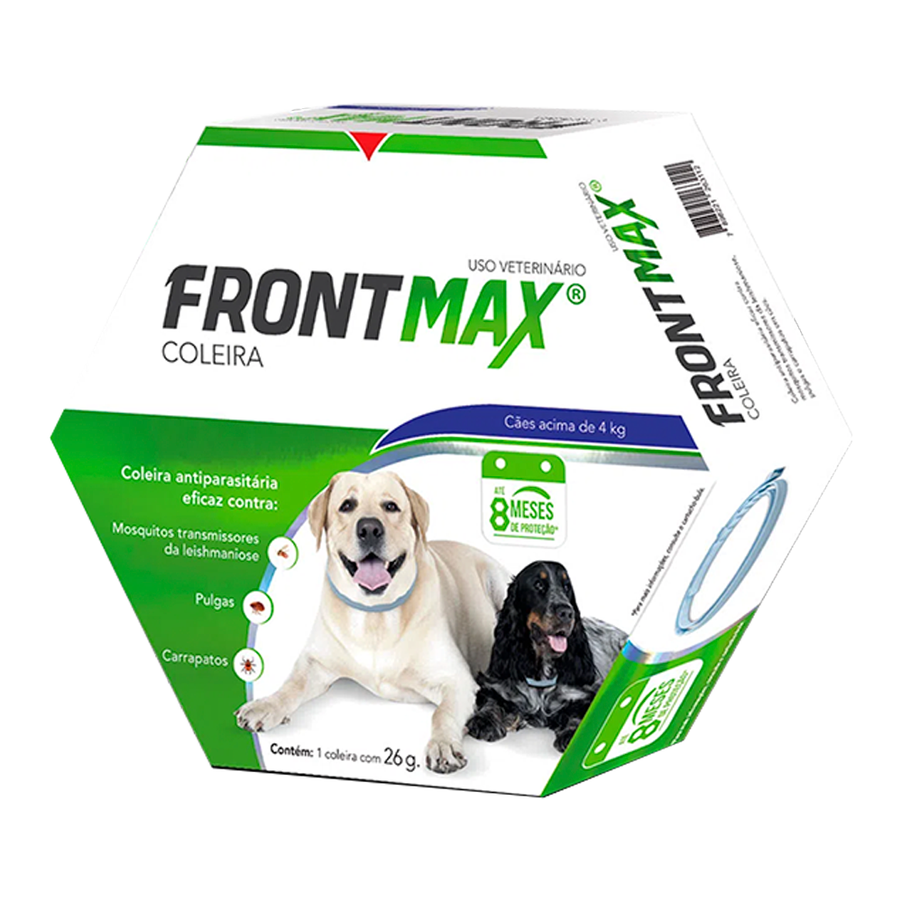 Frontmax coleira é indicado para cães e possui eficácia carrapaticida contra carrapato Rhipicephalus sanguineus e eficácia pulicida contra a pulga Ctenoceplhalides felis felis por até 8 meses, após colocada no pescoço do animal. O produto também possui ação inseticida contra o “mosquito” transmissor da leishmaniose, o flebotomo Lutzomyia longipalpis.