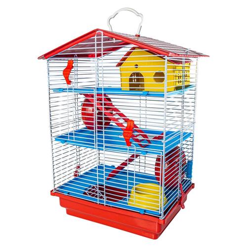 Armação, 1 casinha plástica, 2 rodinhas acrílicas com rolamento, 1 comedouro plástico, 3 andares plásticos, 2 presilhas plásticas, 1 bandeja plástica, 3 escadinhas plásticas e 1 gancho (alça apoio) para teto plástico.