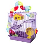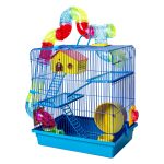 Armação, 1 casinha plástica, 1 rodinha plástica, 1 comedouro, 3 andares em plástico, 1 bandeja plástica, 3 escadinhas aramadas, 1 kit de tubos (10 curvas, 3 retas, 1 T, 2 tampas), 3 placas e 14 anéis.