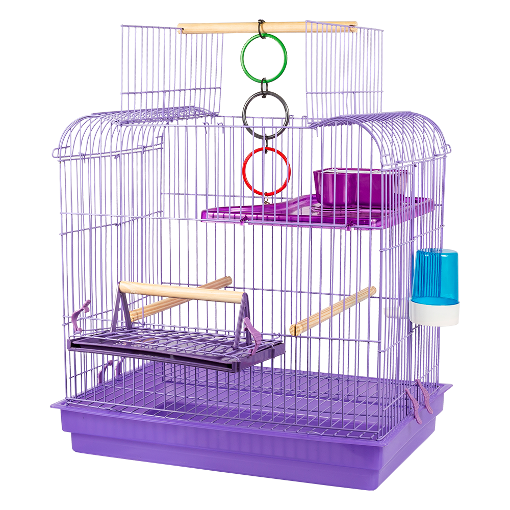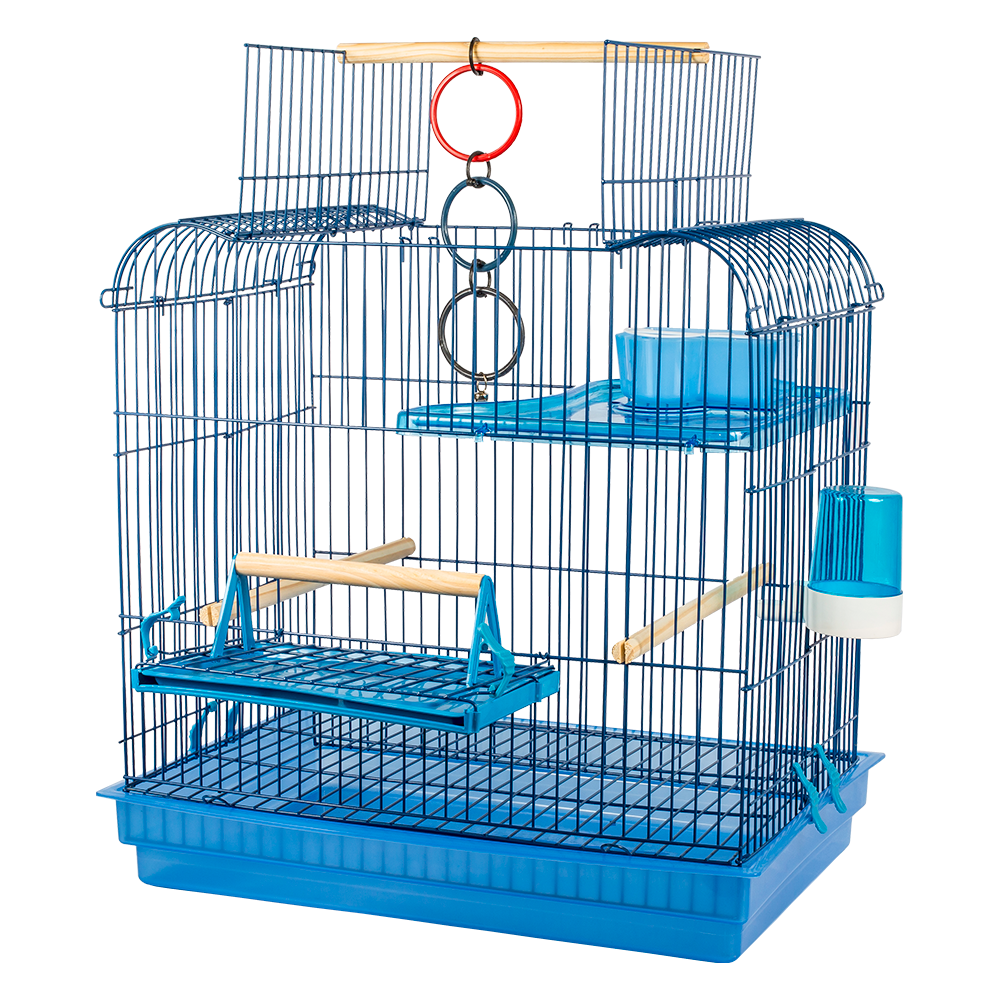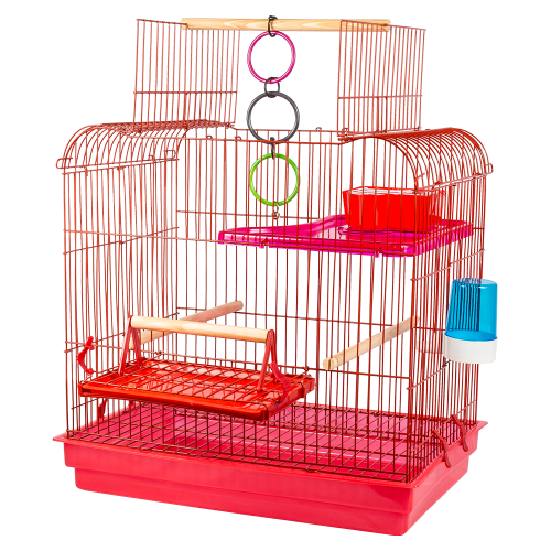 Armação, 2 poleiros grandes, 1 poleiro médio, 1 poleiro pequeno, 1 brinquedo (argolas), 1 comedouro, 1 bebedouro, 6 presilhas plásticas, 1 bandeja higiênica plástica grande, 1 grade aramada que separa as aves dos dejetos, 1 bandeja pequena para poleiro e 1 andar acrílico.