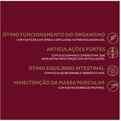 Composição Farinha de Carne e Osso de Bovinos, Farinha de Vísceras de Aves, Farelo de Glúten de Milho-601, Quirera de Arroz, Grão de Milho1, Grão de Sorgo, Feijão Bandinha2, Óleo de Aves, Óleo de Peixe Refinado, Óleo de Linhaça, Polpa Desidratada de Beterraba, Farelo de Trigo, Levedura Seca de Cervejaria, Cloreto de Sódio (Sal Comum), Cloreto de Potássio, Sulfato de Glicosamina, Sulfato de Condroitina, Hidrolisado de Fígado de Aves e Suínos, Aditivo Prebiótico (Parede Celular de Levedura Fonte de Mananoligossacarídeos), Antioxidantes (BHA, BHT), Propionato de Cálcio, Sorbato de Potássio, Aditivo Adsorvente (Parede Celular de Levedura e Bentonita), Vitaminas (A, D3, E, K3, B1, B2, B6, B12, Pantotenato de Cálcio, Ácido Fólico, Ácido Nicotínico, Biotina, Cloreto de Colina), Minerais (Sulfato de Zinco, Sulfato de Ferro, Sulfato de Manganês, Iodato de Cálcio, Selenito de Sódio), Minerais Quelatados (Proteinato de Manganês, Levedura Enriquecida com Selênio, Proteinato de Zinco, Proteinato de Cobre).