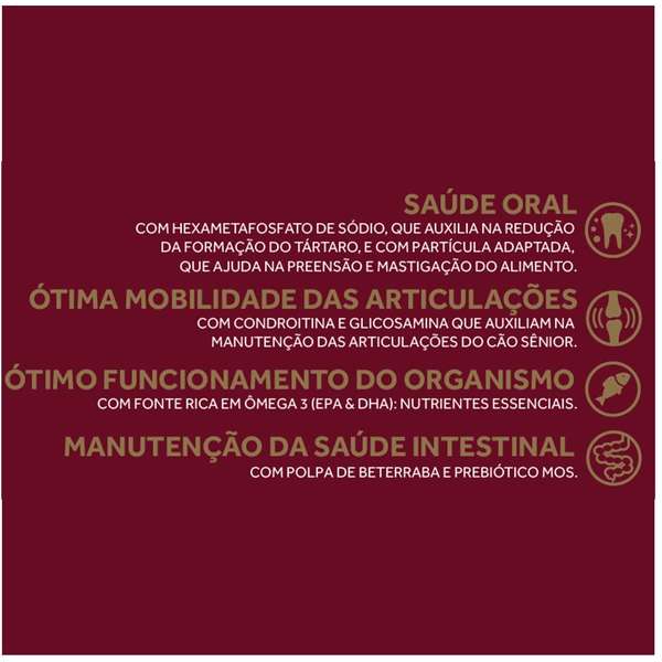 • Ótima mobilidade das articulações, com condroitina e glicosamina que auxiliam na manutenção das articulações do cão sênior;