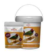 Ovo integral em pó, milho integral*, farelo de soja*, óleo vegetal*, parede celular de levedura (fonte de MOS), farelo de trigo, calcário, fosfato bicálcico, cloreto de sódio, alga Lithothamnium calcarium (fonte de cálcio), DL-metionina, sacarina, antioxidantes (BHT e BHA), minerais orgânicos (cromo, zinco, cobre e selênio), adsorvente de micotoxinas, probióticos, propionato de cálcio (antifúngico), cloreto de colina, premix mineral vitamínico (vitamina A, vitamina D3, vitamina E, vitamina K3, vitamina B1, vitamina B2, vitamina B6, vitamina B12, ácido pantotênico, niacina, ácido fólico, biotina, vitamina C, selenito de sódio, sulfato de cobre, sulfato de ferro, monóxido de manganês, iodato de potássio, óxido de zinco, amilase, xilanase, protease e β-glucanase) e aroma de fruta idêntico ao natural.