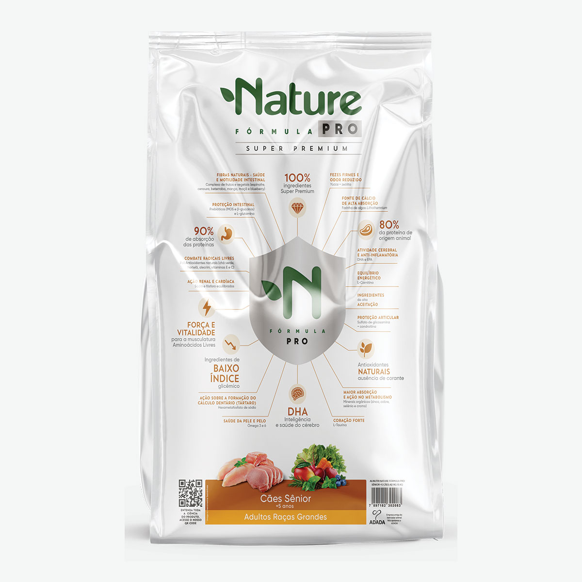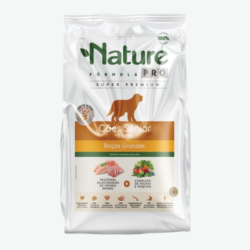 Farinha de vísceras de aves (26,00%), farinha de torresmo (2,00%), farinha de peixes (1,00%), complexo de frutas e vegetais desidratados (espinafre em pó (0,08%), cenoura em pó (0,07%), polpa de beterraba (0,15%), manga (0,10%), maçã (0,10%) e mirtilo em pó – blueberry (0,02%)), arroz quebrado, sorgo integral moído, ervilha moída desidratada, biomassa de microalgas 0,05% (Schizochytrium sp.) – Fonte de DHA, algas calcárias (0,10% – Lithothamnium calcarium), fibra de cana-de-açúcar, óleo de aves, fosfato bicálcico, hemoglobina desidratada de bovino, cloreto de sódio (sal comum), L-glutamina, L-ácido glutâmico, L-taurina, L-carnitina, L-lisina, L-metionina, L-treonina, sulfato de condroitina, sulfato de glicosamina, hexametafosfato de sódio, zeólita, extrato de Yucca Schidigera, ácido propiônico, sorbato de potássio, cloreto de colina, hidrolisado de fígado de aves e suínos, aditivo prebiótico (parede celular de levedura e extrato de leveduras – fonte de prebióticos MOS e Beta glucanos), proteinato de zinco, proteinato de cobre, proteinato de selênio, levedura enriquecida com cromo, antioxidantes naturais – 0,06% (acetato de Dl-alfa-tocoferol, extrato de alecrim, extrato de chá verde e extrato de hortelã) e premix vitamínico e mineral (retinol, colecalciferol, menadiona bissulfito de nicotinamida, tiamina, riboflavina, piridoxina, cianocobalamina, ácido pantotênico, niacina, ácido fólico, biotina, ácido ascórbico polifosfato, selenito de sódio, sulfato de cobre, sulfato de ferro, óxido de manganês, iodato de cálcio e óxido de zinco).