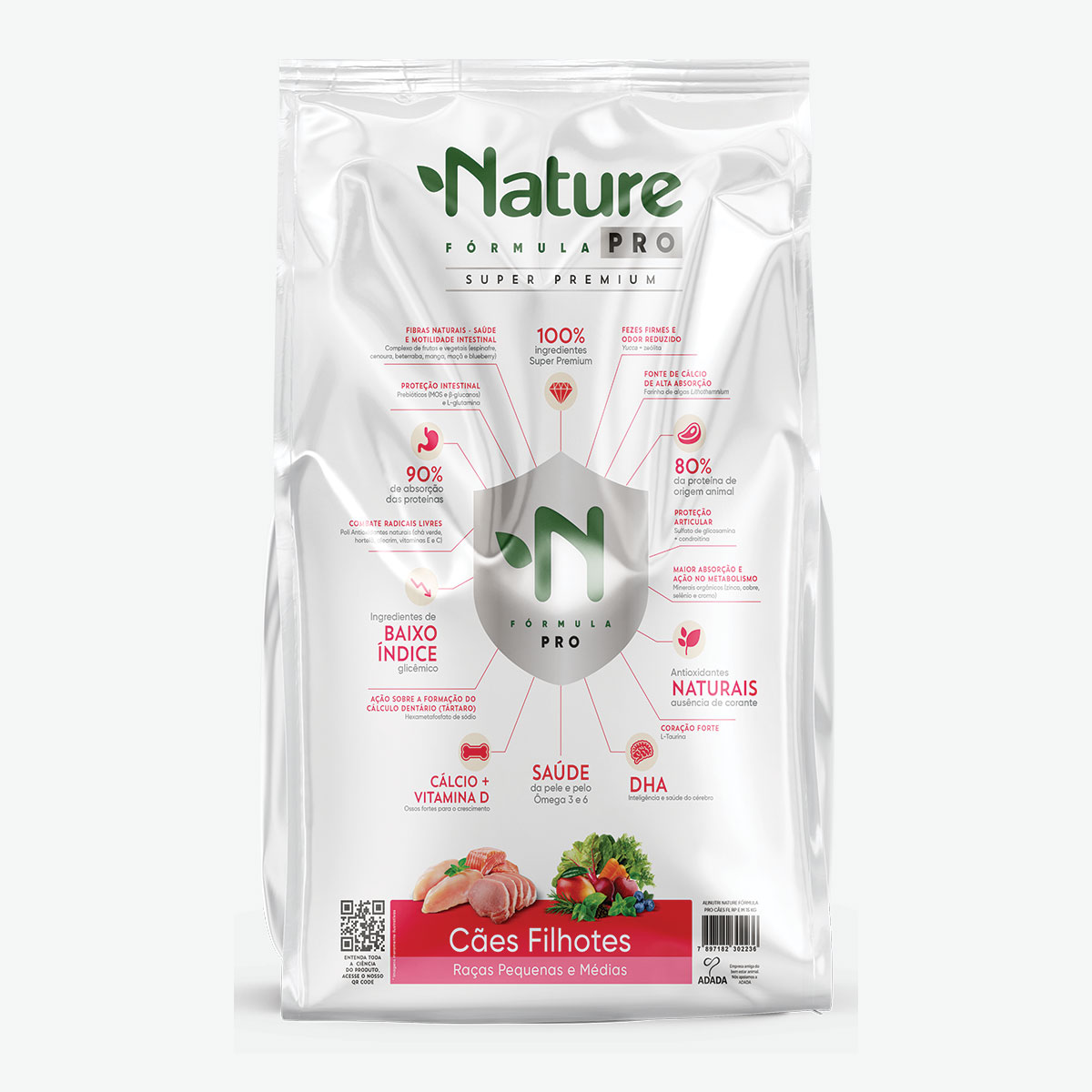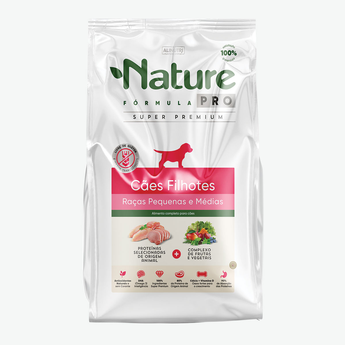 Farinha de vísceras de aves (34,00%), farinha de torresmo (2,00%), farinha de peixes (1,00%), complexo de frutas e vegetais desidratados (espinafre em pó (0,08%), cenoura em pó (0,07%), polpa de beterraba (0,15%), manga (0,10%), maçã (0,10%) e mirtilo em pó – blueberry (0,02%)), arroz quebrado, sorgo integral moído, ervilha moída desidratada, biomassa de microalgas 0,05% (Schizochytrium sp.) – Fonte de DHA, algas calcárias (0,10% – Lithothamnium calcarium), fibra de cana-de-açúcar, óleo de aves, fosfato bicálcico, hemoglobina desidratada de bovino, cloreto de sódio (sal comum), L-glutamina, L-ácido glutâmico, L-taurina, sulfato de condroitina, sulfato de glicosamina, hexametafosfato de sódio, zeólita, extrato de Yucca Schidigera, ácido propiônico, sorbato de potássio, cloreto de colina, hidrolisado de fígado de aves e suínos, aditivo prebiótico (parede celular de levedura e extrato de leveduras – fonte de prebióticos MOS e Beta glucanos), proteinato de zinco, proteinato de cobre, proteinato de selênio, levedura enriquecida com cromo, antioxidantes naturais – 0,06% (acetato de Dl-alfa-tocoferol, extrato de alecrim, extrato de chá verde e extrato de hortelã) e premix vitamínico e mineral (retinol, colecalciferol, menadiona bissulfito de nicotinamida, tiamina, riboflavina, piridoxina, cianocobalamina, ácido pantotênico, niacina, ácido fólico, biotina, ácido ascórbico polifosfato, selenito de sódio, sulfato de cobre, sulfato de ferro, óxido de manganês, iodato de cálcio e óxido de zinco).
