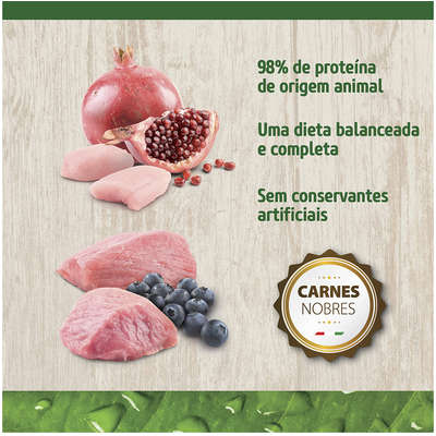 | Composição | Carne de frango (mecanicamente separada), farinha de vísceras de aves (mín. 10%), ovo desidratado, farinha de peixe, farinha de torresmo (proteína isolada de suíno), amido de batata, amido de mandioca, óleo de frango, óleo de peixe, polpa de beterraba, casca de ervilha, alfafa desidratada, lignocelulose, semente de psyllium, levedura seca de cervejaria, cenoura desidratada, espinafre desidratado, laranja desidratada, maçã desidratada, blueberry desidratado, extrato de romã (mín.0,08%), extrato de chá verde, extrato de aloe vera, cúrcuma em pó, beta caroteno, luteína, aditivos prebióticos (FOS e MOS), DL-metionina, taurina, L-carnitina, sulfato de condroitina, sulfato de glicosamina, extrato de yucca, zeolita, hidrolisado de fígado de frango e suíno, vitaminas (A, D3, E, B1, B2, B6, B12, C, biotina, niacina, ácido pantotênico, ácido fólico, cloreto de colina), cloreto de potássio, ferro aminoácido quelato, cobre aminoácido quelato, zinco aminoácido quelato, manganês aminoácido quelato, proteinato de selênio, iodato de cálcio, propionato de cálcio, concentrado de tocoferóis. Eventual substitutivo: proteína hidrolisada de peixe. | ||||||||||||||||||||||||||||||||||||||||||||