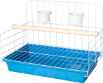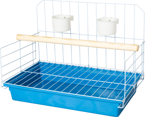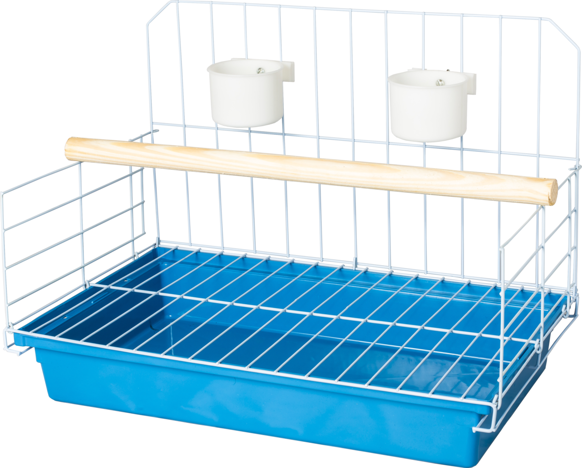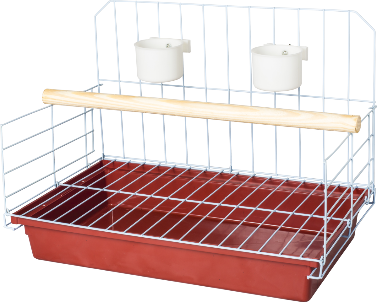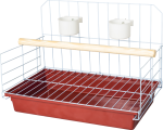 Armação, 2 comedouros, 1 poleiro grande, 1 grade aramada que separa a ave dos dejetos e 1 bandeja grande.