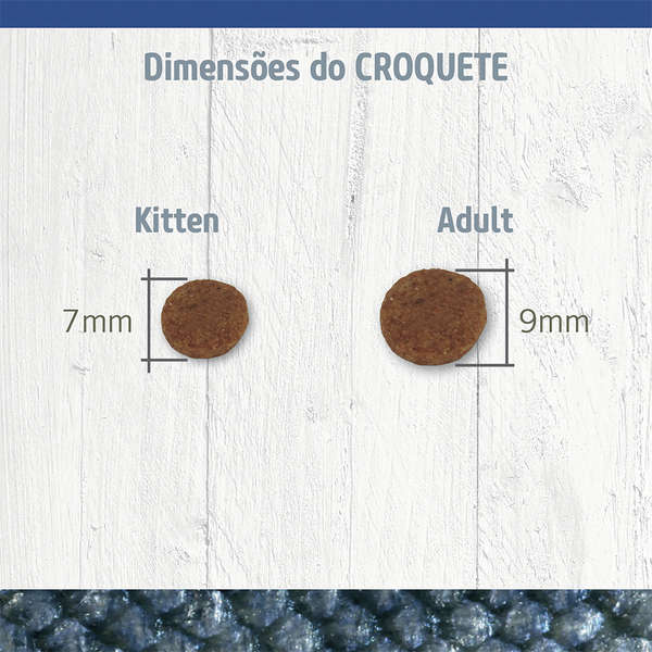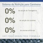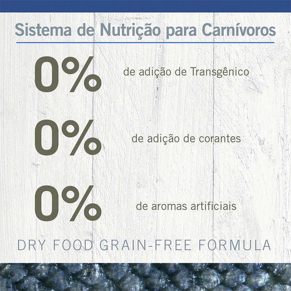 Salmão (carne mecanicamente separada de salmão, farinha de salmão – mín. 8%), farinha de peixe, farinha de vísceras de aves, farinha de torresmo, ovo em pó, amido de batata, amido de mandioca, óleo de peixe, óleo de frango, polpa de beterraba, casca de ervilha, alfafa desidratada, celulose em pó, lignocelulose, semente de psyllium, levedura seca de cervejaria, melão desidratado (mín. 0,1%), cenoura desidratada, espinafre desidratado, laranja desidratada, maçã desidratada, extrato de mirtilo (blueberry), extrato de romã, extrato de chá verde, extrato de aloe vera, cúrcuma em pó, beta caroteno, aditivos prebióticos (FOS e MOS), DL-metionina, taurina, L-carnitina, sulfato de condroitina, sulfato de glicosamina, aditivos adsorventes (extrato de yucca e zeolita), hidrolisado de fígado de aves e suínos, vitaminas (retinol (A), colecalciferol (D3), acetato de DL-alfa-tocoferol (E), tiamina (B1), riboflavina (B2), cloridrato de piridoxina (B6), cianocobalamina (B12), ácido ascórbico monofosfato (C), biotina, niacina, ácido pantotênico, ácido fólico, cloreto de colina), cloreto de potássio, cloreto de amônio, ferro aminoácido quelato, cobre aminoácido quelato, zinco aminoácido quelato, manganês aminoácido quelato, proteinato de selênio, iodato de cálcio, propionato de cálcio, concentrado de tocoferóis. Eventuais substitutivos: proteína hidrolisada de peixe, proteína hidrolisada de frango. |