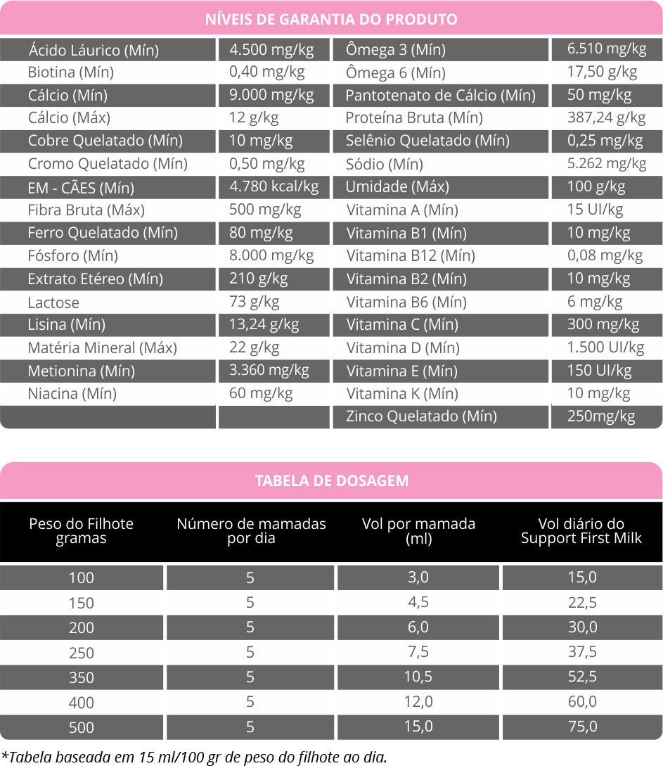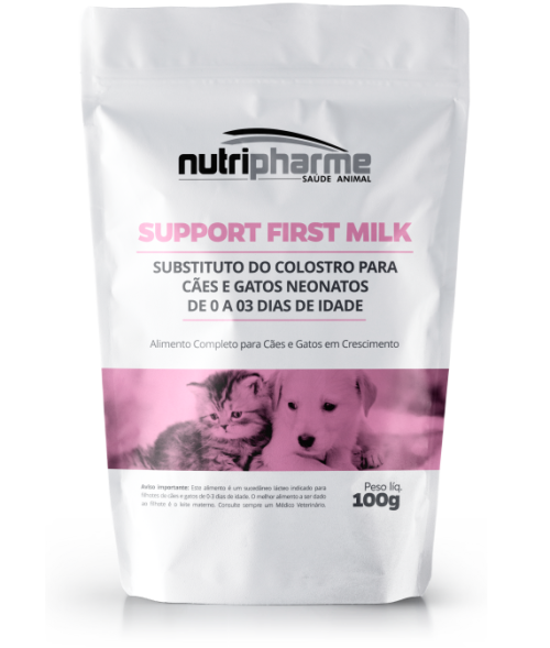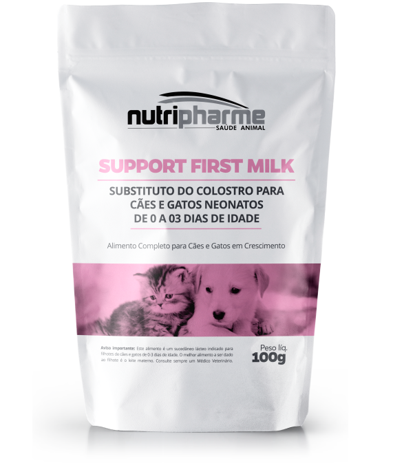 Alimento completo balanceado para cães e gatos neonatos de 0-3 dias de idade como substituto do colostro. Indicado para os casos de privação do colostro materno, tais como: morte da mãe, ausência de produção de leite (agalaxia), rejeição do filhote pela fêmea, neonatos muito fracos que não conseguem amamentar sozinhos. Support First Milk é indicado para Cães e Gatos nas primeiras horas de vida até 03 dias de idade. A partir do quarto dia de idade pode substituir pelo sucedâneo de leite Support Milk Dog (Cães) ou Support Milk Cat (Gatos), de acordo com a referida espécie.