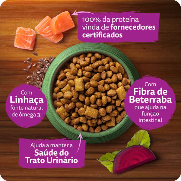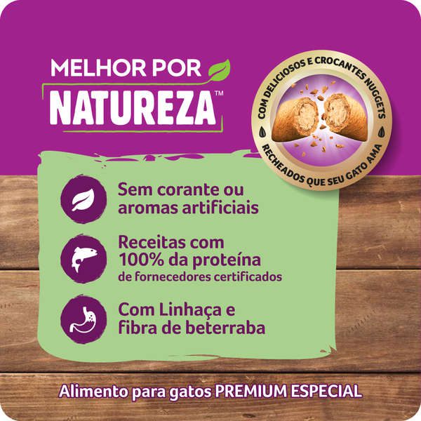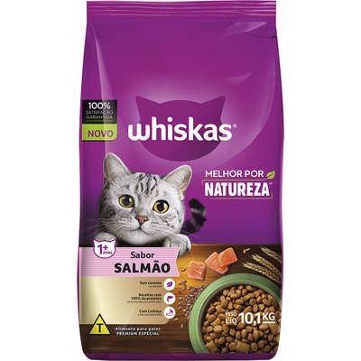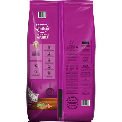 Novo WHISKAS® MELHOR POR NATUREZA™ tem receitas deliciosas, incluindo ingredientes naturais que seu gato precisa para sua saúde. A Ração Whiskas Melhor Por Natureza Salmão Gatos Adultos é um alimento premium especial, nutricionalmente completo e balanceado, com um ótimo equilíbrio de vitaminas e minerais para ajudá-lo a fornecer os melhores cuidados para o seu gato adulto. Contém fibra de beterraba que ajuda na digestão e função intestinal saudáveis. Contém linhaça, fonte natural de ômega 3. Ração Anti Bola de Pelo, com fibras naturais que auxiliam na eliminação de bolas de pelos, e deliciosos e crocantes nuggets recheados que seu gato ama. Sem corantes ou aromas artificiais, e receitas com 100% de proteína de fornecedores certificados. As receitas de WHISKAS® são desenvolvidas com base na ciência do Centro de Pesquisas WALTHAM®, a maior autoridade mundial no cuidado e nutrição de animais de estimação.